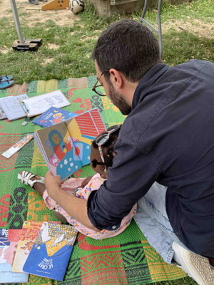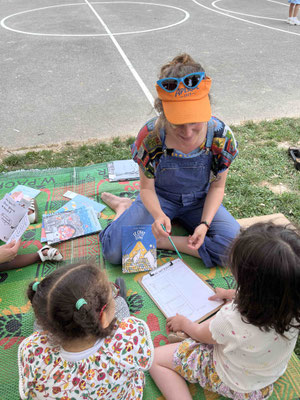 Lecture d'albums jeunesse et quiz autour du livre Le Chat qui voulait voir les étoiles avec Zoé Landry & Luna Granada à la Fête de L'Île-Saint-Denis, Square Fackler (juillet 2025)