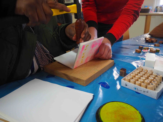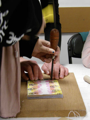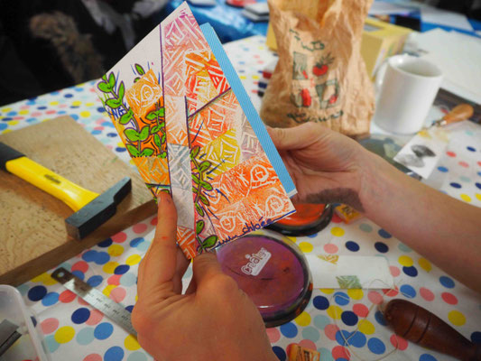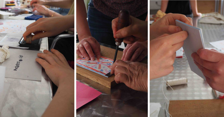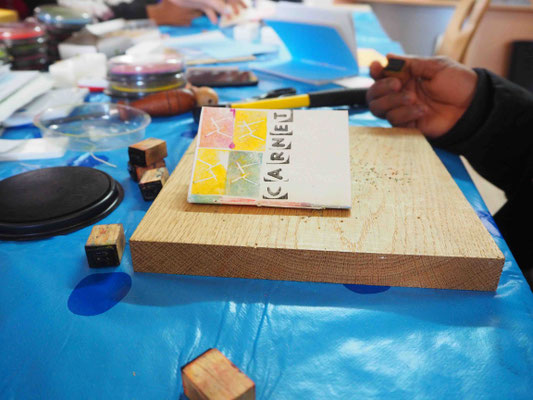 Réalisation d'un carnet à partir de feuilles de récupération, avec reliure et couverture en gravure sur gomme. Une invitation à y écrire et/ou dessiner ses rêves, ses envies, ses projets