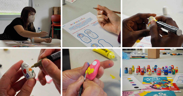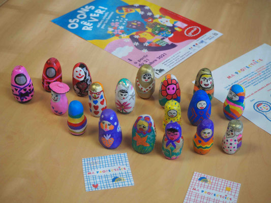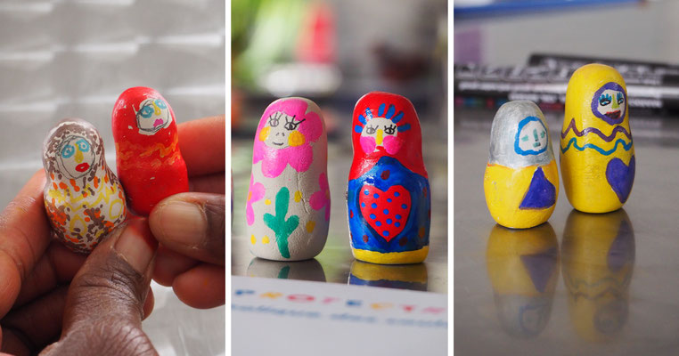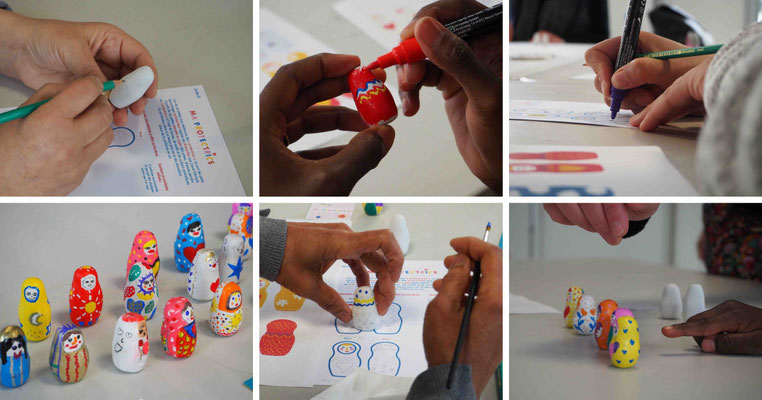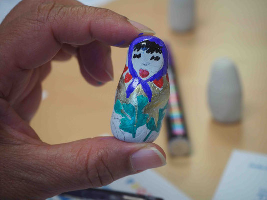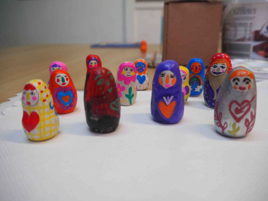 Réalisation de petits personnages porte-bonheur inspirés des matriochkas que l'artiste intervenante aura fabriqués. À partir de ces petites statuettes en argile déjà prêtes, chacune peindra sa