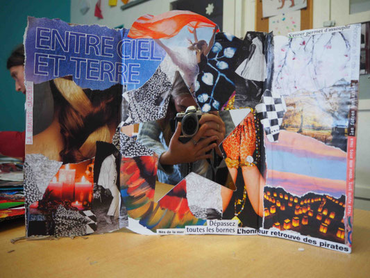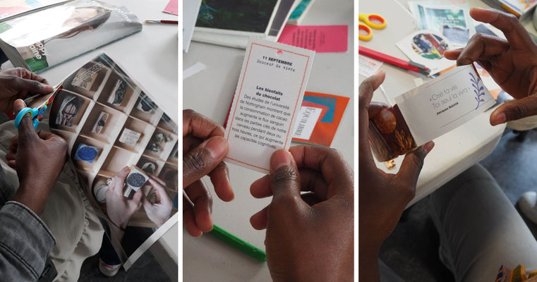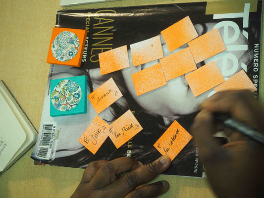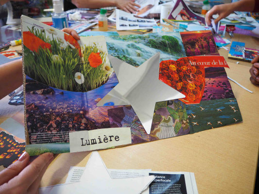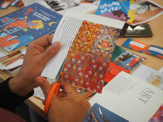 Réalisation d'un tableau de rêves, à partir de collages d'images et de mots piochés dans des magazines.