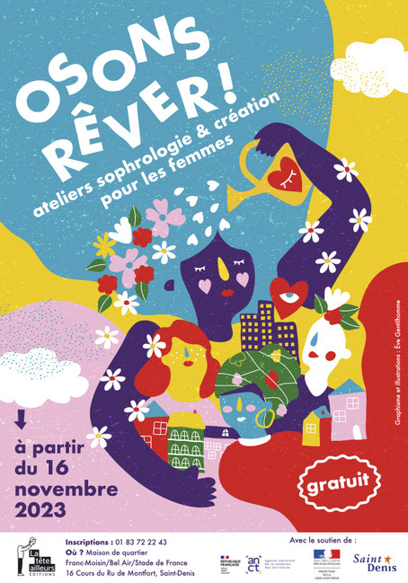 Après le succès du projet "Osons rêver !", imaginé à partir de l'album jeunesse La nuit tombe, Maman rêve en 2021, La tête ailleurs propose un nouveau cycle "Osons rêver ! #2" autour du bien-être et de la confiance en soi, réservé aux femmes. À travers des séances de sophrologie et des ateliers créatifs, les participantes sont invitées à oser prendre du temps pour soi, oser se détendre, oser créer !
