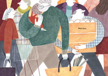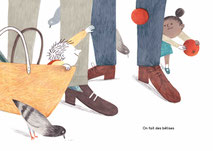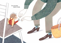 Et puis, dans l’histoire, l’adulte qui l’accompagne est un personnage très tendre et protecteur qui est aussi chargé de faire les courses : je n’avais pas envie que ça soit la maman ! Je pense que c’est important de créer des personnages masculins qui incarnent l’amour et la tendresse. Sinon, j’avais pensé montrer le personnage de la mère au petit déjeuner, ou au lever de l’enfant… mais je me suis dit que cela correspondait trop à la représentation de la famille traditionnelle, et j’ai finalement préféré laisser plus d’ouverture.
