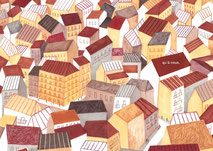 A : Il s’agit d’une ville imaginaire : je voulais qu’elle puisse être n’importe quelle ville. Mais j’ai représenté les façades ocres et des toits en tuiles, ce qui fait plutôt penser à des villes du Sud de l’Europe : c’est un choix complètement personnel, affectif.