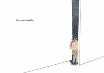 A : Je dirais que dans cet album, le texte et l’image agissent sur deux plans très différents. Le texte n’est pas narratif, mais plutôt, en effet, philosophique et poétique : c’est pourquoi je voulais que les images apportent des personnages concrets, auxquels on peut s’attacher, et une histoire avec ses petits rebondissements. Je tenais à ce que les illustrations montrent, contrairement au texte, des situations ordinaires, presque anodines. Il me semble que l’humour se dégage justement de ce décalage entre le texte et l’image.